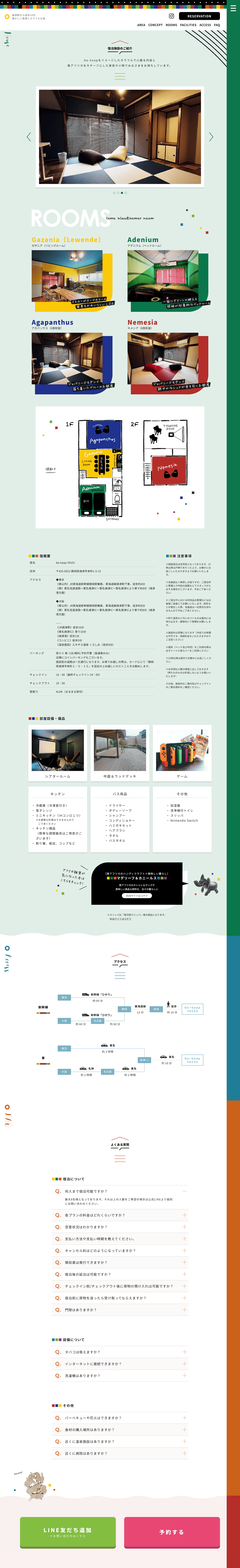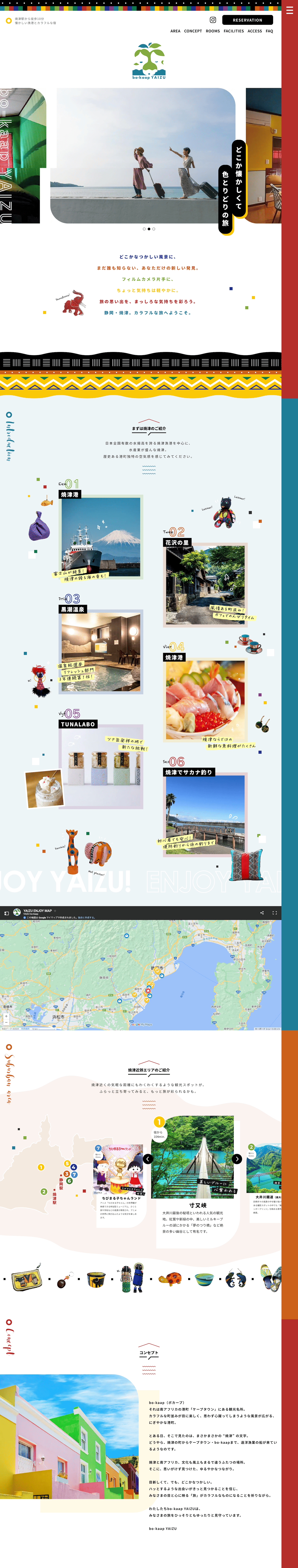 南アフリカのケープタウンにある観光名所 bo-kaap(ボカープ)をテーマとした、焼津の宿泊施設「bo-kaap YAIZU」のランディングページです。南アフリカを連想させるカラフルなデザインと、アフリカの雑貨が数多く配置されているのが特徴的です。